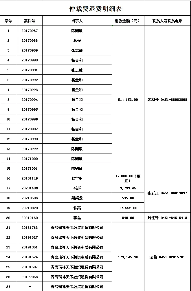 哈尔滨仲裁委员会对已生效仲裁案件,且符合退费条件尚未退费的情况进行了专项统计,请符合条件的当事人及时办理退费手续,经审核批准后予以退付。
