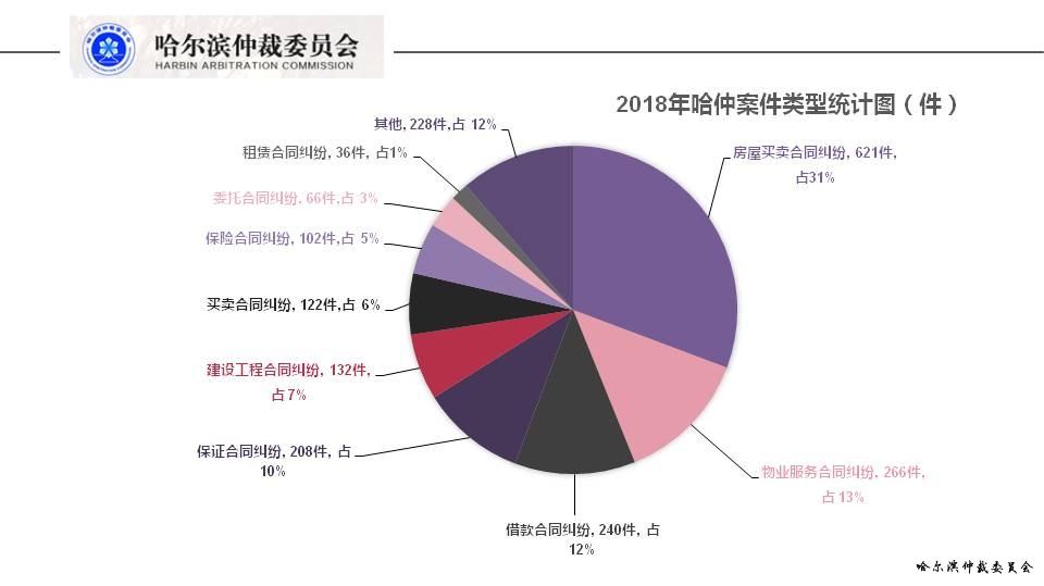 1.仲裁逐步走进百姓生活。仲裁在商事领域发挥优势作用的同时,在解决民生领域的纠纷中起了重要作用。哈仲受理了大量二手房买卖合同以及物业服务合同等纠纷,这类案件的标的额通常较小,当事人矛盾较大。哈仲大量通过简易程序审理,并重视案件调解,使得这类纠纷得到了较为快速和妥善的解决,有效化解矛盾。