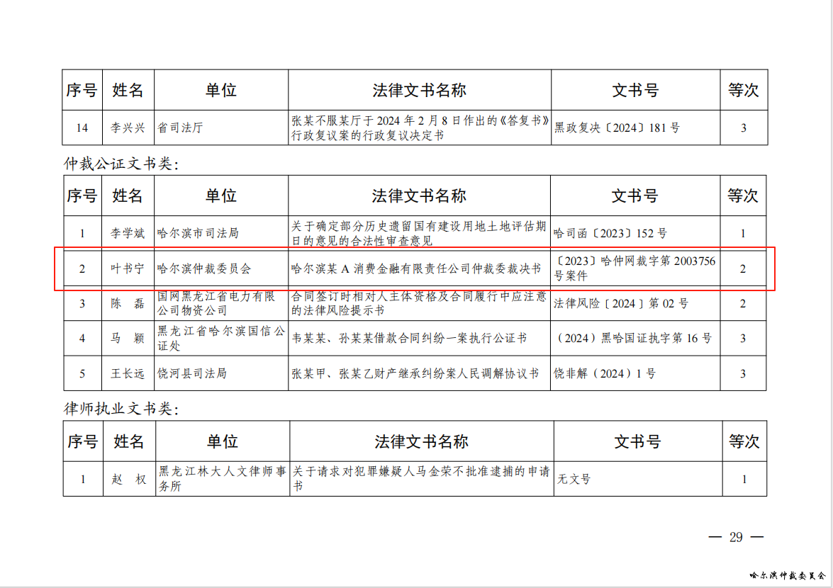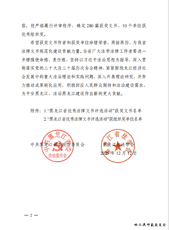 近日,中共黑龙江省委政法委员会、黑龙江省法学会印发《关于黑龙江省优秀法律文书评选活动评选结果的通报》中,哈尔滨仲裁委员会(以下简称哈仲)叶书宁同志荣获仲裁公证文书类二等奖。